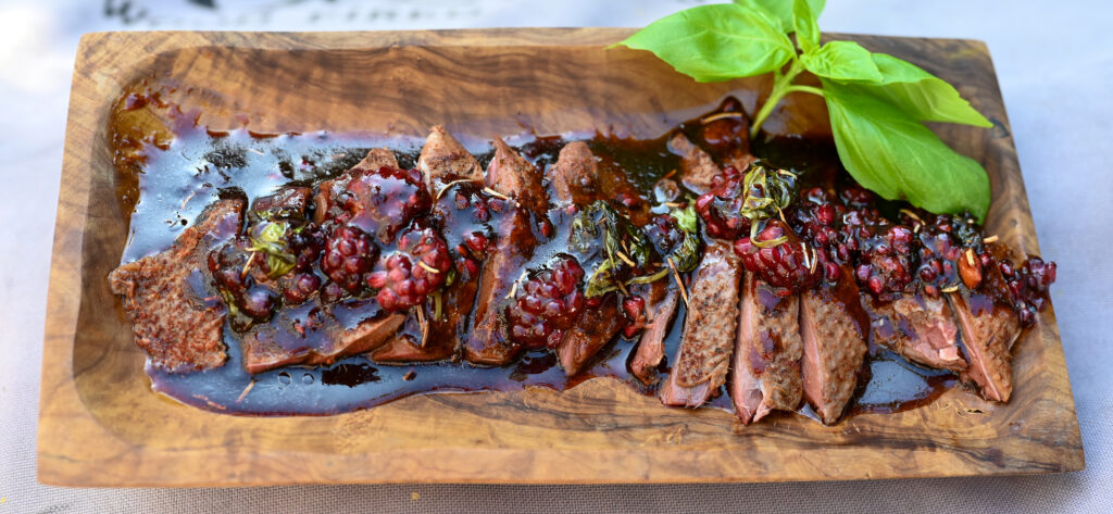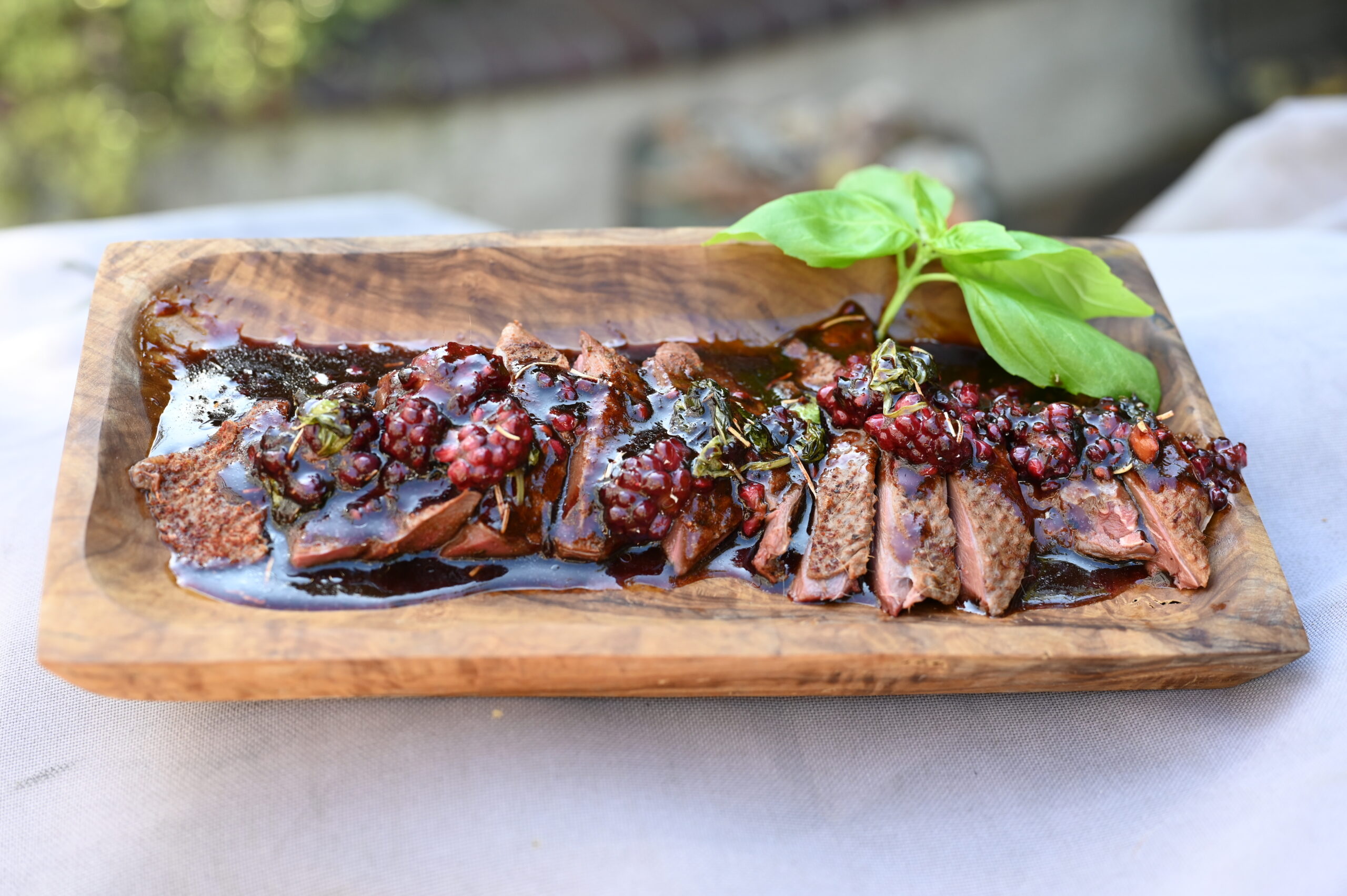 Serve any extra sauce on the side. Hickory smoke, rich goose, sweet berries, sharp balsamic, and the clean pop of basil come together in one plate that feels like wild country and summer garden in the same bite.